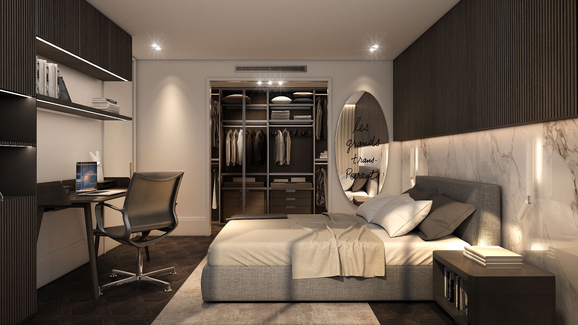 Malzeme seçimlerinde Calacatta mermeri ortak alanlarda süreklilik sağlarken, Marmara mermeri banyolarda daha yumuşak bir etki oluşturdu. Axor Citterio ve Fantini Bianche armatürleri kalite ve dayanıklılığı desteklerken, Arttek Parke tarafından üretilen özel marküteri zeminler mekana zanaat hissi kazandırdı. Schüco doğrama sistemleri ise konfor ve uzun ömürlü kullanım hedefini tamamladı.