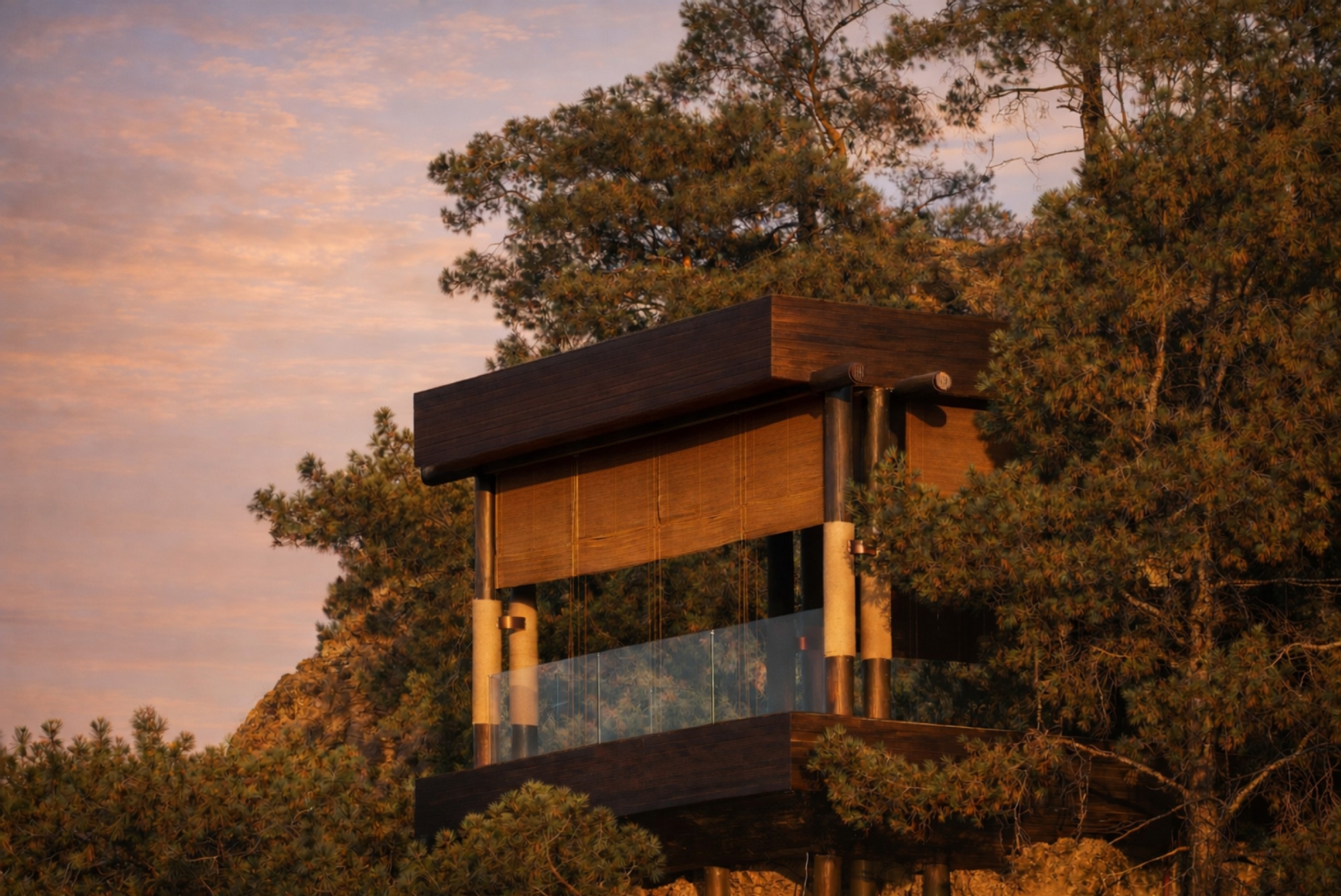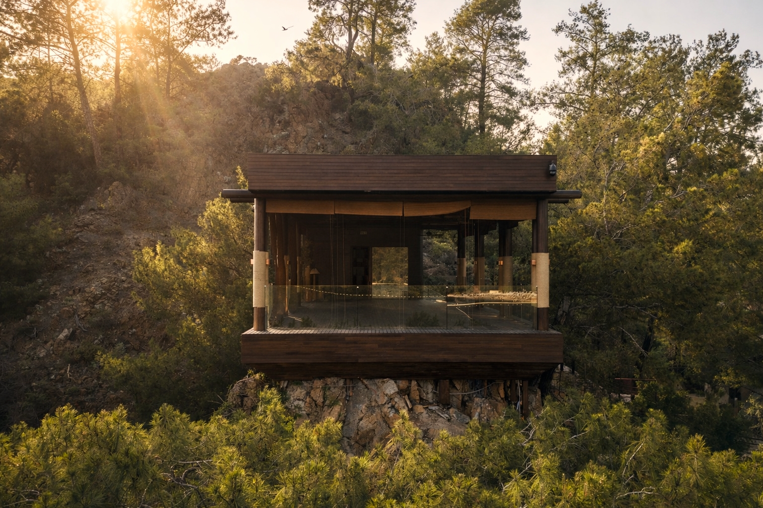 The yoga space draws inspiration from the principles of inner balance, awareness and mental clarity found in yoga practice. The structure was conceived as an open architectural system that establishes a strong relationship with the surrounding landscape and natural topography. A timber truss structure, reminiscent of bamboo construction, defines the space while creating a light and natural architectural presence. The ends of the structural elements incorporate the Ahama logo, establishing a subtle connection between architecture and brand identity.