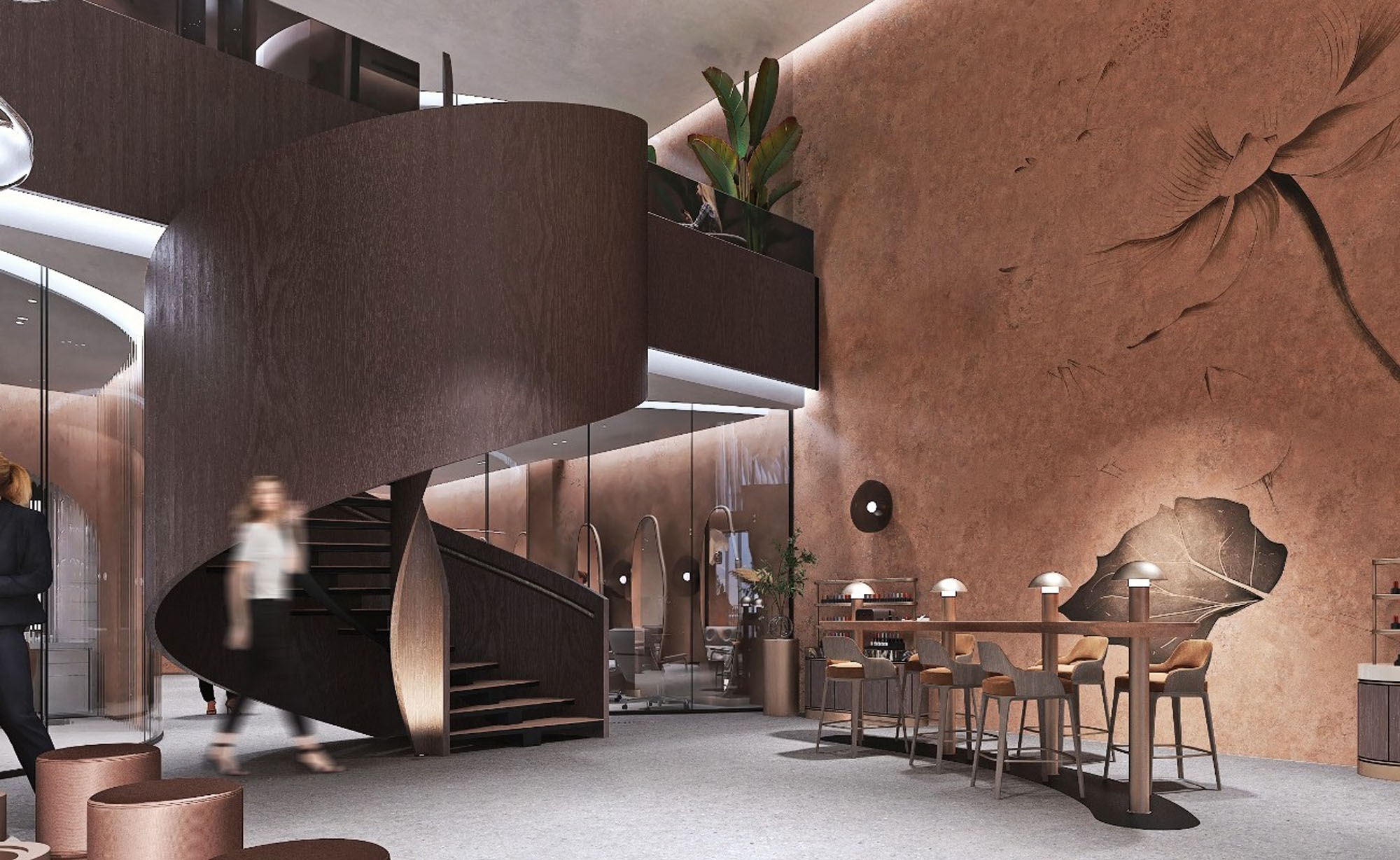 Akışkan hatlara sahip resepsiyon bankosu mekandaki hareketi yönlendirirken, heykelsi merdiven düşey dolaşımı mekansal deneyimin parçası haline getiriyor. Yüzeyler arasındaki yumuşak geçişler ve ışıkla kurulan kontrollü ilişki, dengeli ve bütüncül bir atmosfer oluşturuyor.