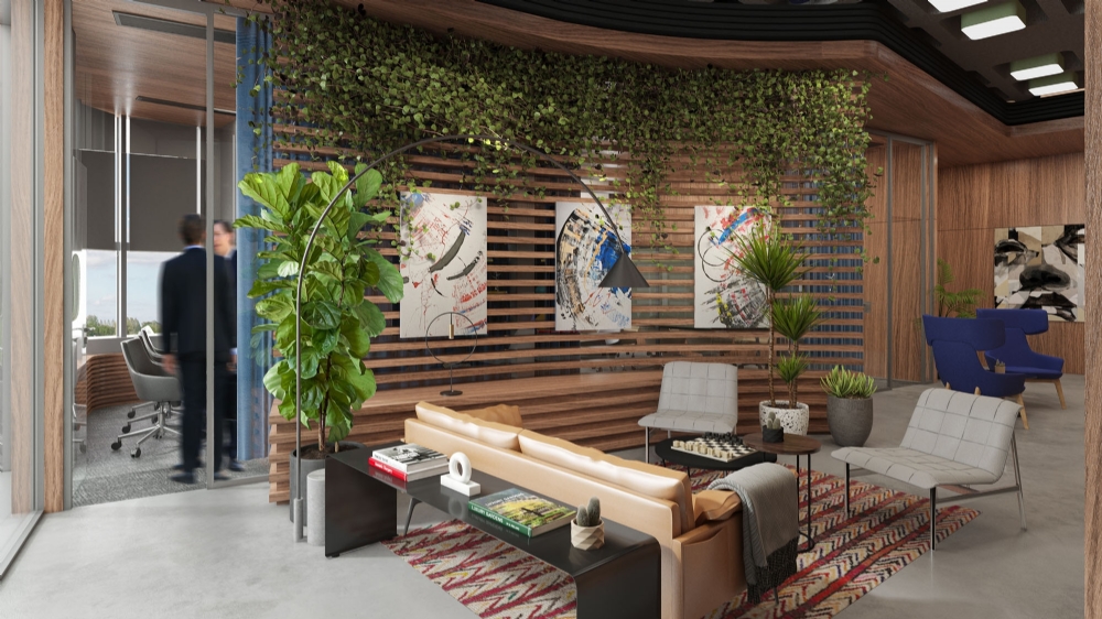 İç mekanda doğal malzemeler, gün ışığını maksimum seviyede içeri alan planlama kararları ve biyofilik tasarım yaklaşımı ön plana çıkmıştır. Bitkisel dokular, sıcak yüzeyler ve katmanlı mekan organizasyonu, yoğun iş temposu içinde kullanıcı konforunu artıran bir atmosfer oluşturmuştur.