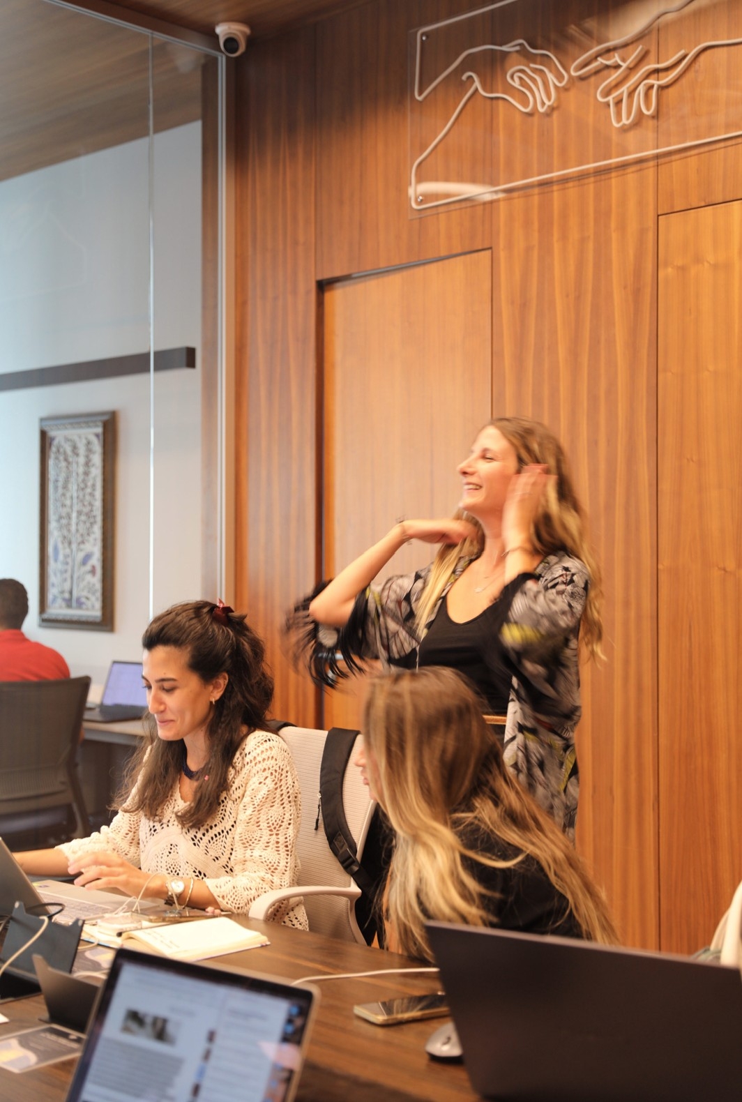 In the main circulation areas, custom-designed curvy lighting elements create a sense of flow and visual continuity across floors. The social area features a transformable amphitheater, which adapts throughout the day as a working and gathering space, while also functioning as a flexible stage for events, presentations, and community activities.