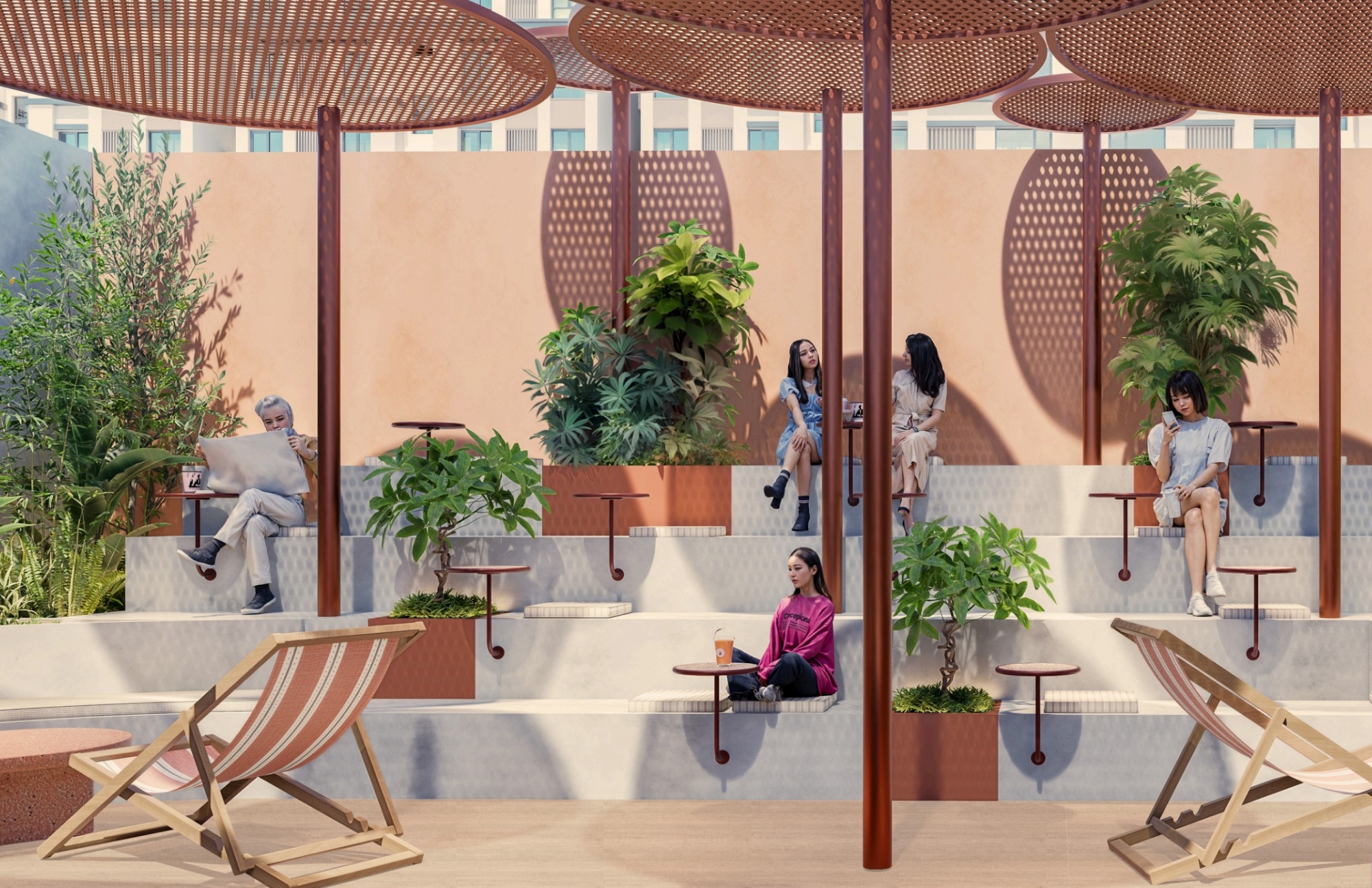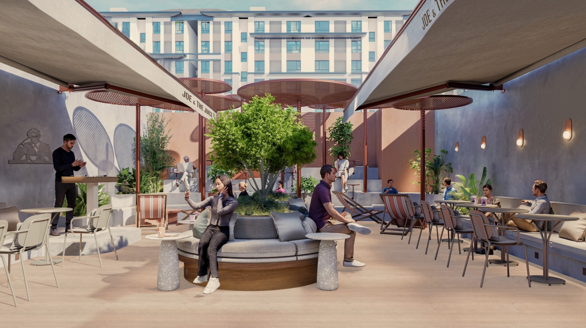 One of the project’s prominent features is the backyard area, where custom-designed sunshade systems enhance outdoor use and create a comfortable, year-round social environment. This outdoor space supports Joe & the Juice’s culture of gathering and interaction, offering a relaxed setting that remains closely connected to the city.