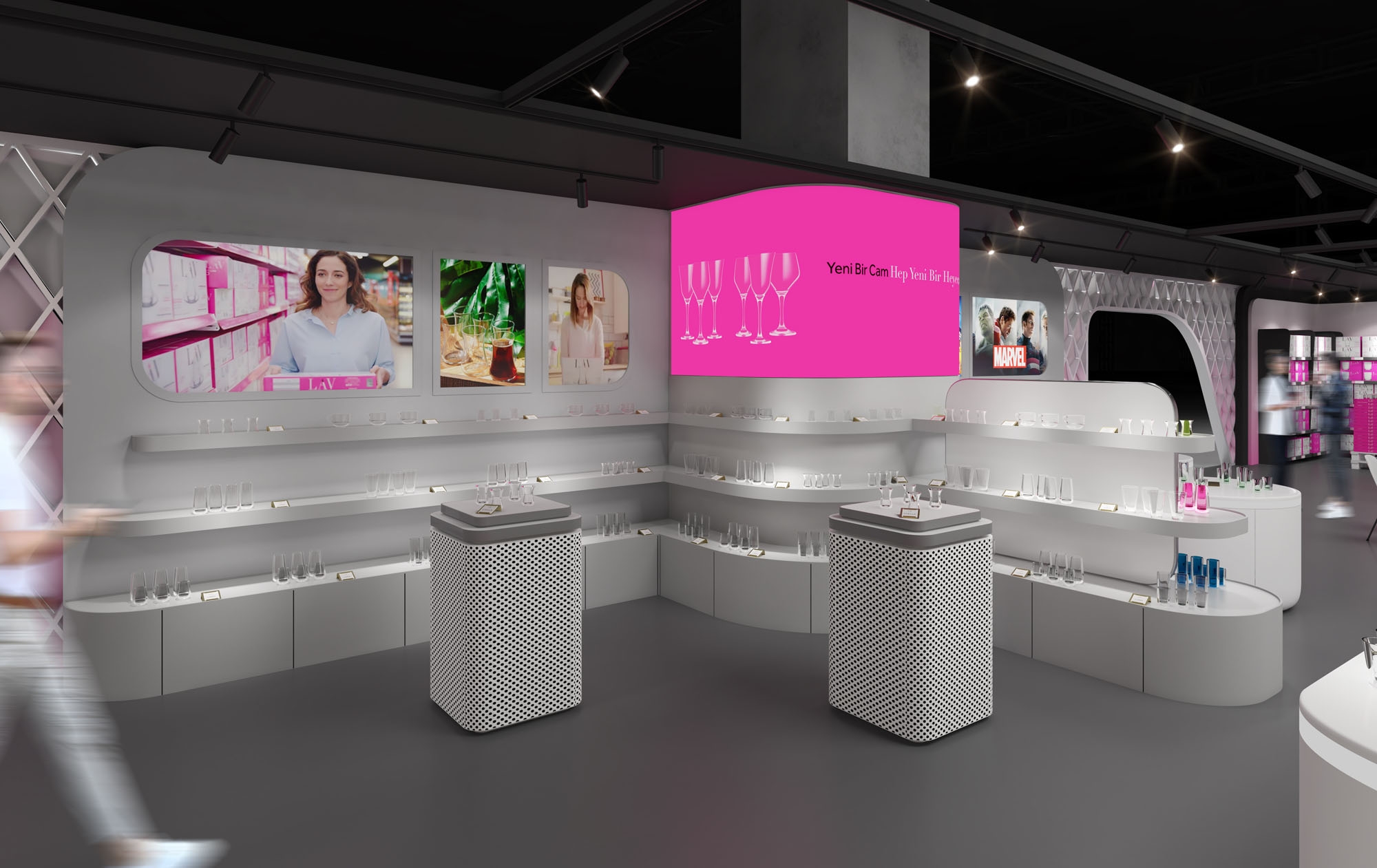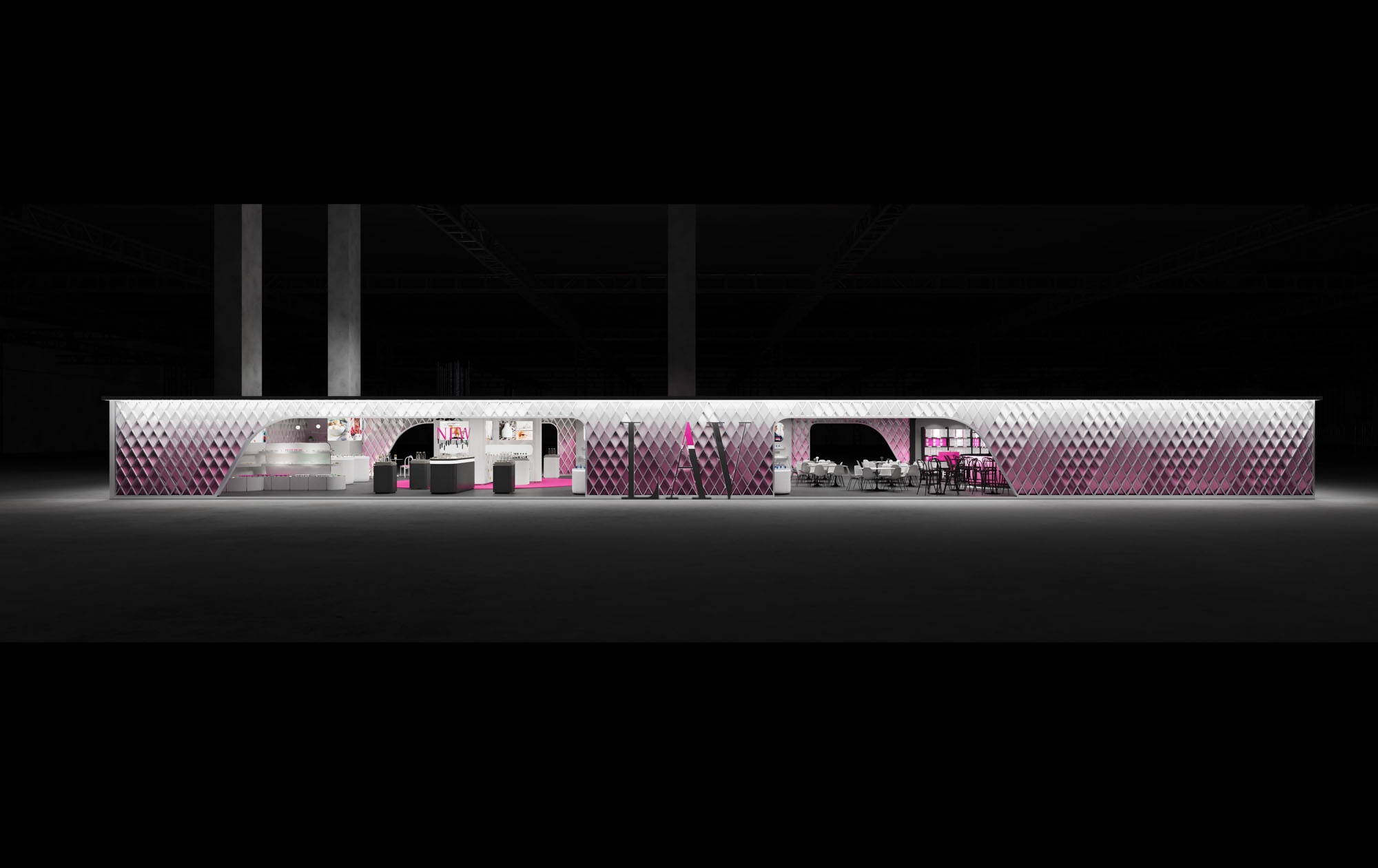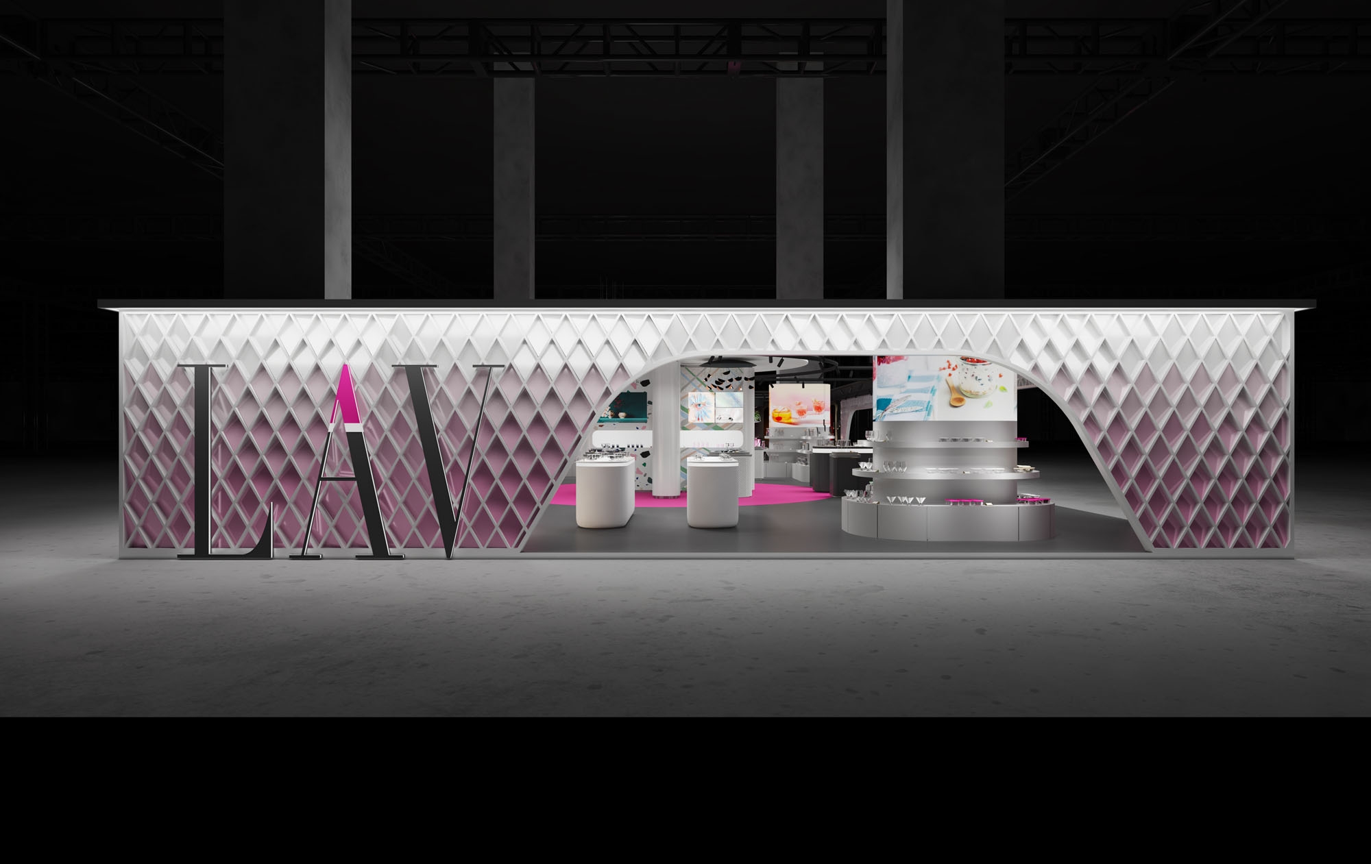 Lav Cam için Almanya, Frankfurt’ta düzenlenen Ambiente Fuarı kapsamında tasarlanan fuar standı, Toros and Partners tarafından markanın dişil, zarif ve akışkan karakterini mekansal bir anlatıya dönüştürme yaklaşımıyla ele alındı. Standın ana yüzeyini oluşturan kinetik cephe, hareket hissi yaratan katmanlı yapısıyla ziyaretçiyi fuar akışı içinde fark edilir bir odak noktasına yönlendirirken, pembe ile sedefli beyaz arasında kurulan gradyan geçiş markanın cam üretimindeki incelik ve ışıkla kurduğu ilişkiye referans veriyor.