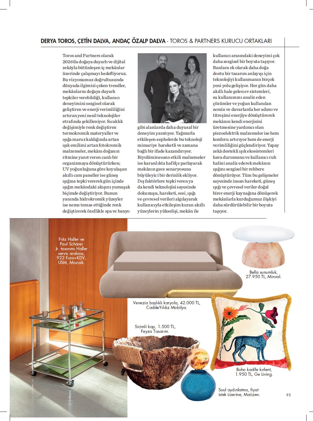 Toros and Partners, Marie Claire Maison’da yer alarak tasarım alanındaki vizyonunu paylaştı. Derya Toros, Çetin Dalva ve Andaç Özalp Dalva; doğa ile bütünleşen, teknoloji destekli ve kullanıcı deneyimini merkeze alan yeni nesil mekan anlayışını ele aldı.