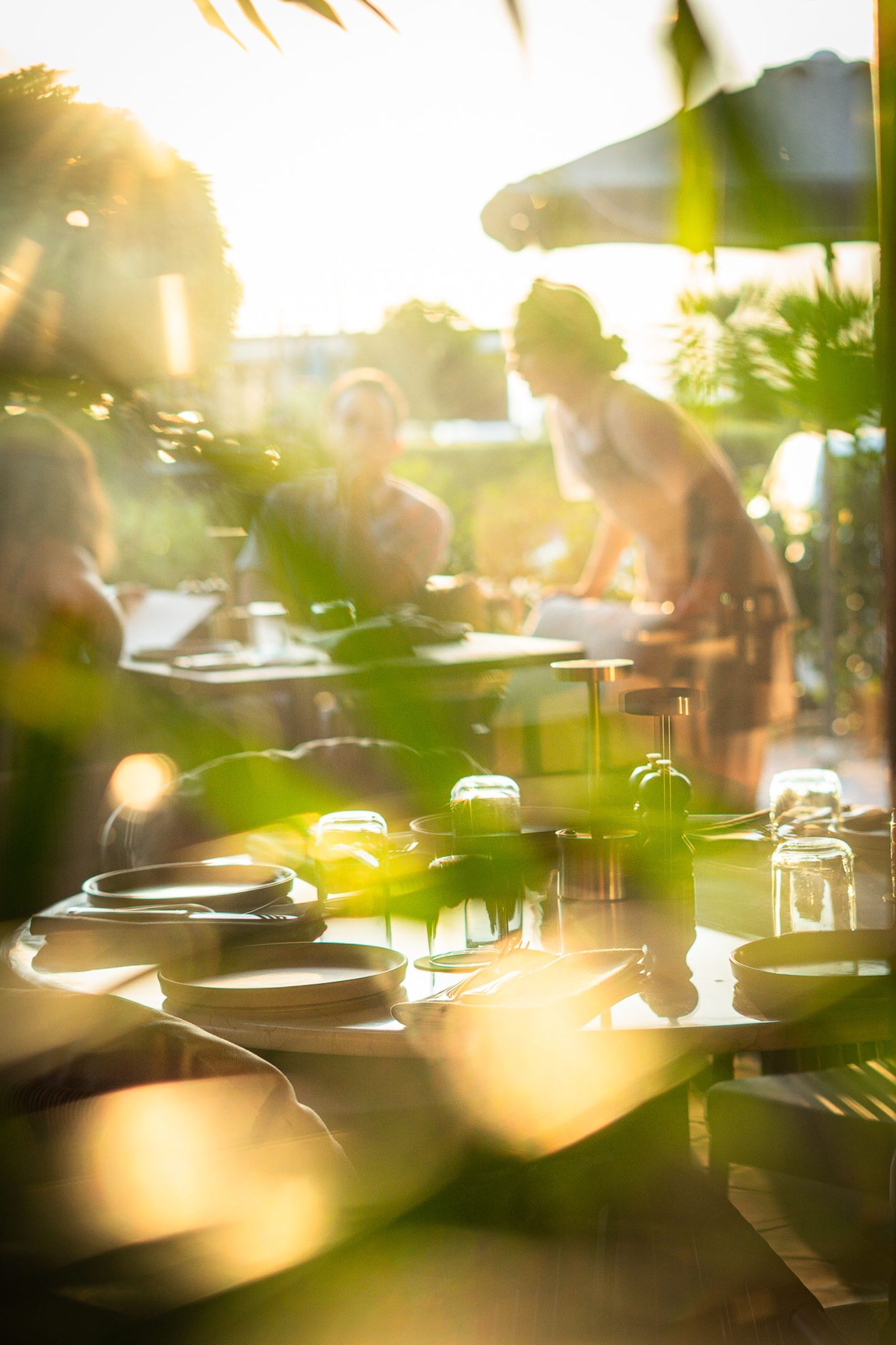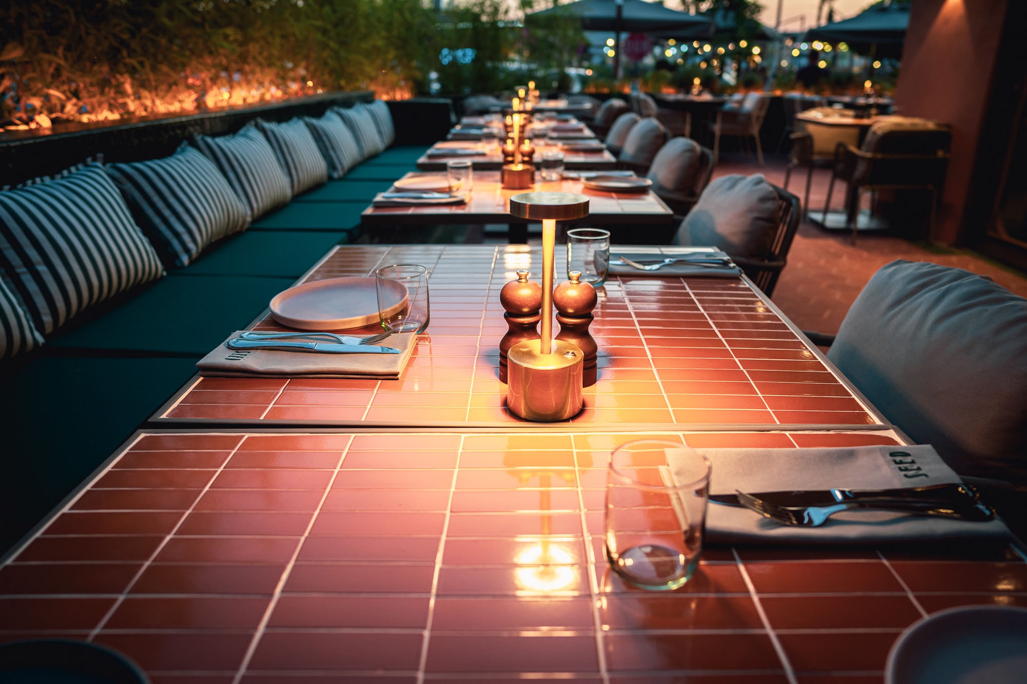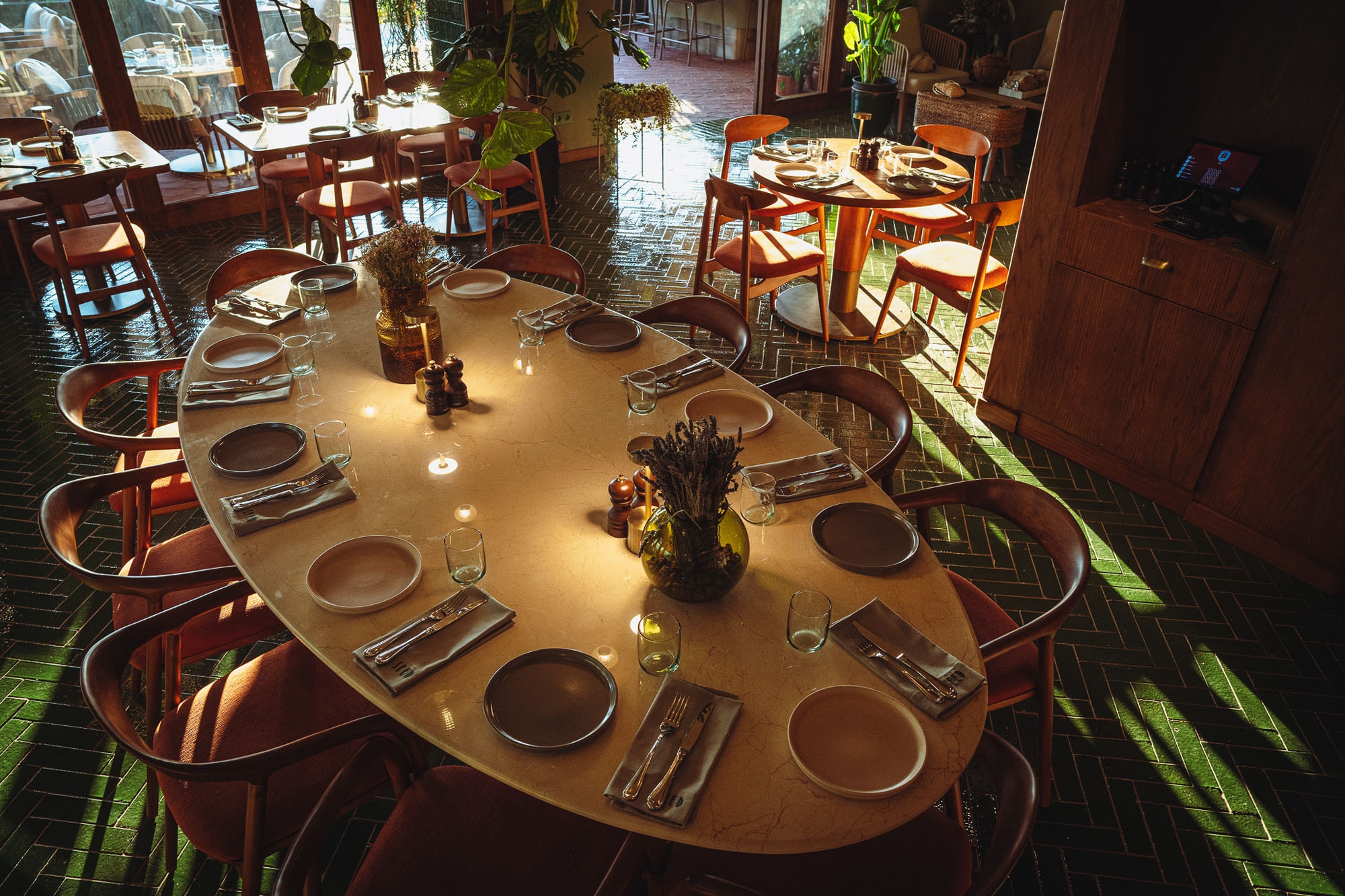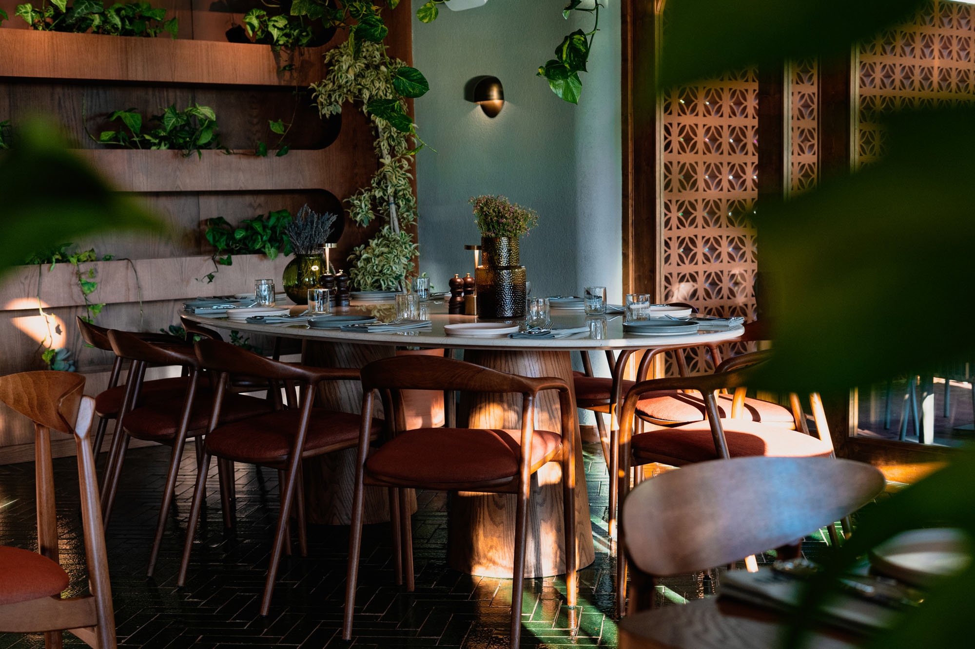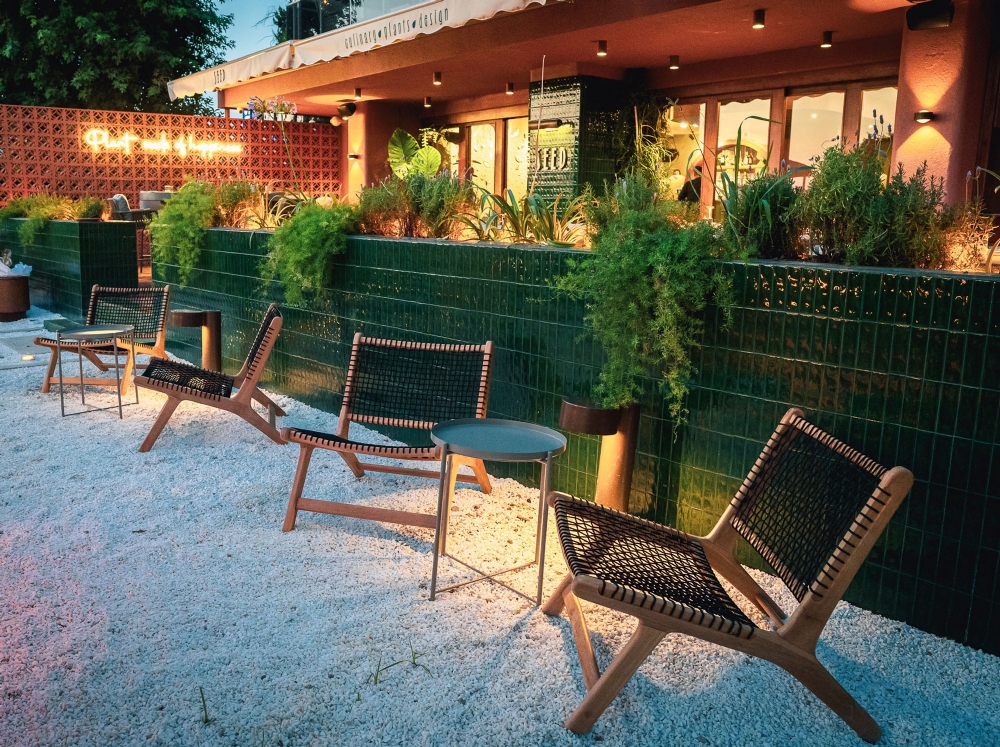 Tasarımda yerel malzeme hissi ön planda tutuldu. Yeşil terracotta seramik yüzeyler, toprak tonları ve el yapımı aydınlatmalar gün ışığıyla birlikte değişen sıcak bir ortam oluşturacak biçimde kurgulandı. Bitkiler mekana eklenen objeler olarak değil, zamanla büyüyen ve mekansal süreklilik kuran canlı bir katman olarak ele alındı. Planlama yaklaşımı, öğle saatlerinden gün batımına ve akşam kullanımına uzanan akışkan bir deneyim hedefiyle şekillendi.