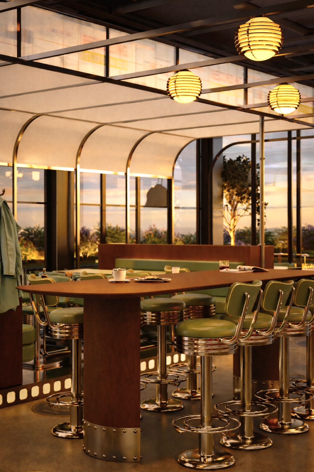 Projenin çıkış noktası, geçmişin tanıdık görsel hafızasını korurken, bugünün teknolojik olanaklarıyla yeni bir mekan dili üretmektir. Cephede kullanılan sarı beyaz çizgili tenteler, klasik yol kenarı Amerikan diner referanslarını taşırken; krom detaylı oturma elemanları ve endüstriyel aydınlatma unsurları mekana çağdaş bir karakter kazandırır.