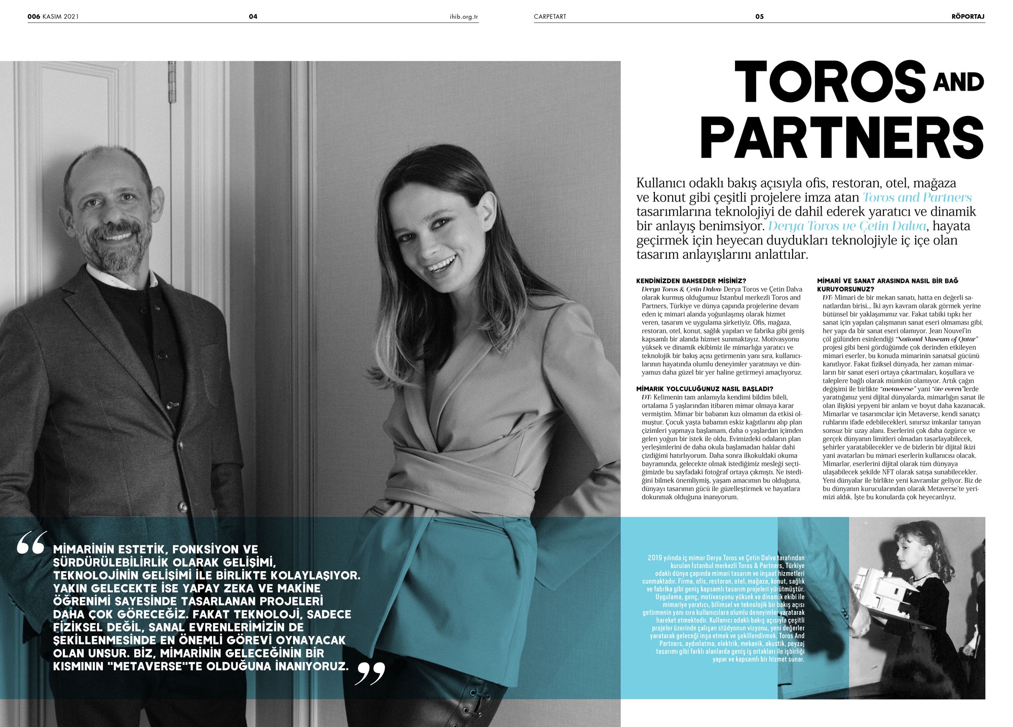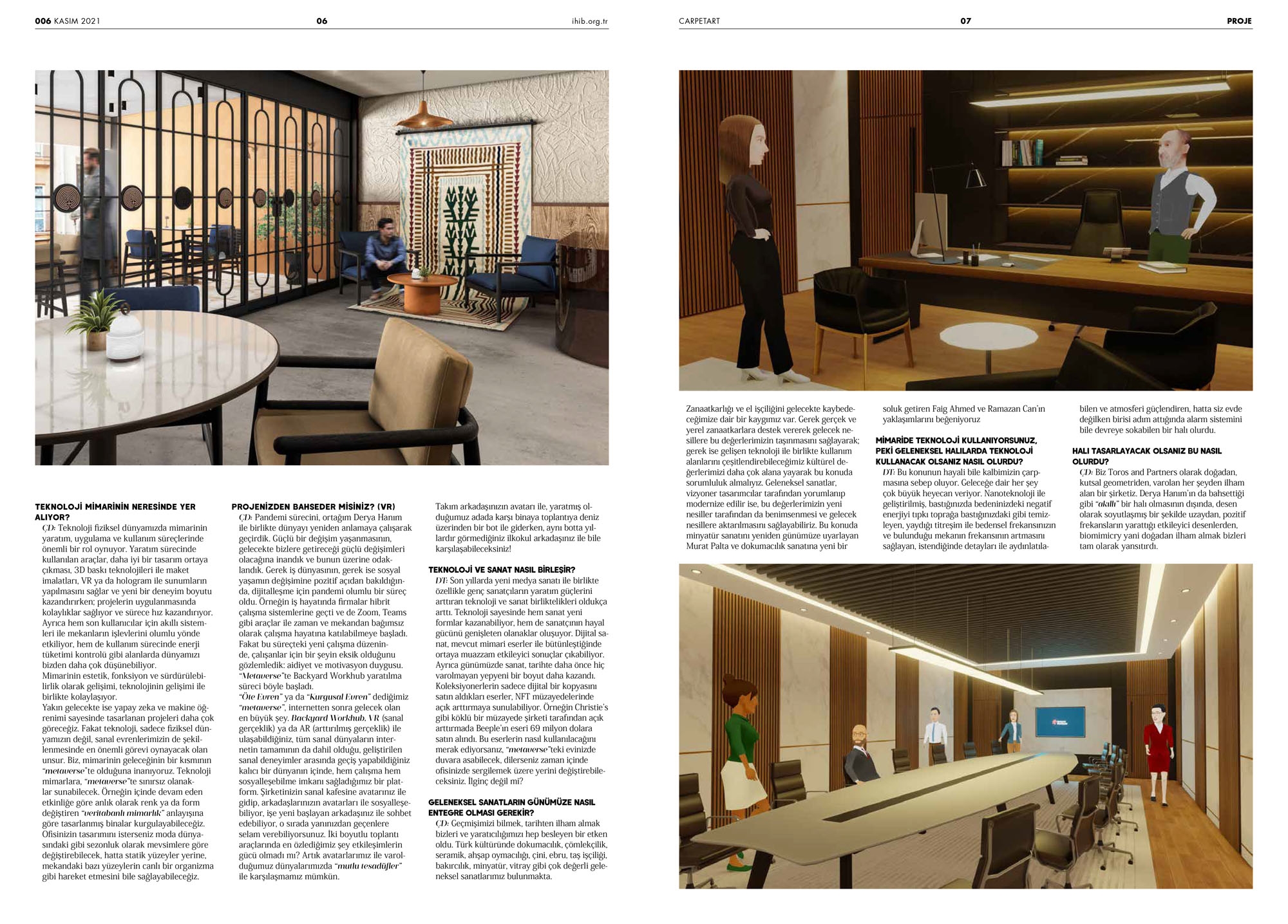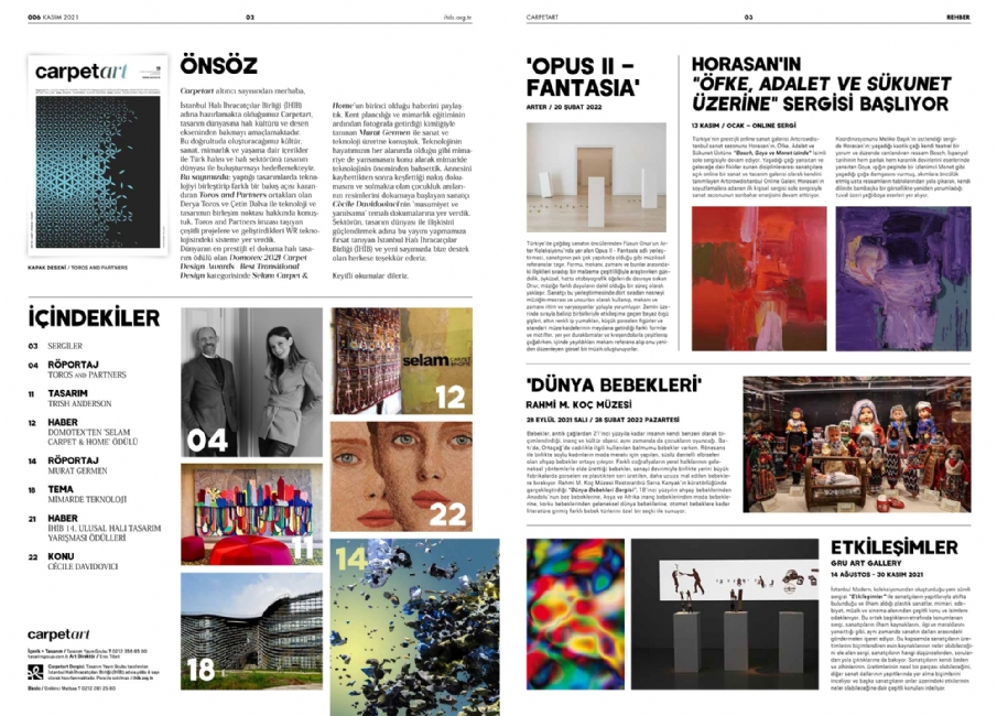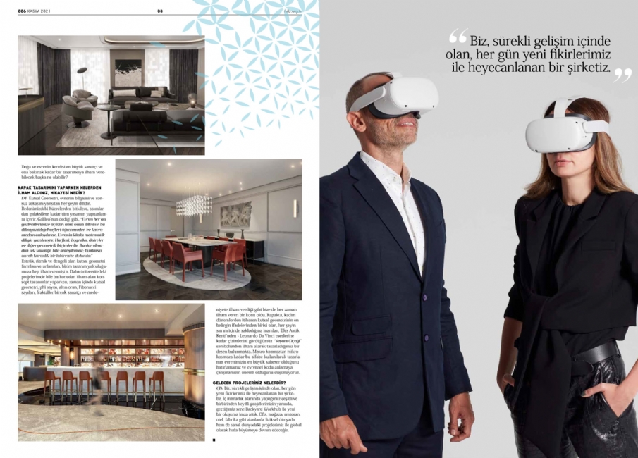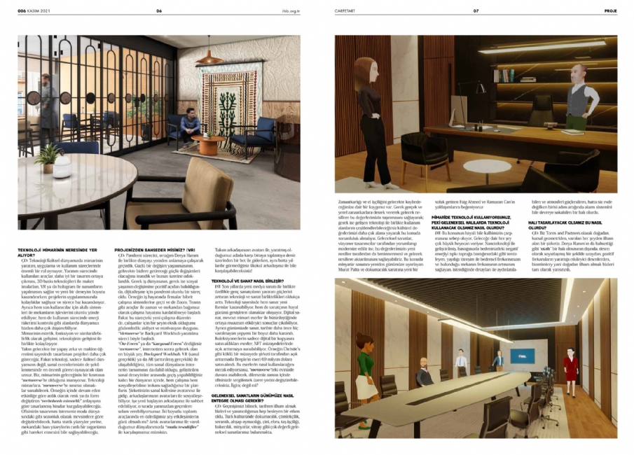 Toros and Partners, yakın zamanda carpetArt Magazine dergisinde dijital çağda mimarlığa dair bakış açılarını paylaşıyor. Tasarım, teknoloji ve yaratıcılığı bir araya getiren stüdyo, mimari mekanların dönüşümüne yönelik yeni yaklaşımlar üzerine çalışıyor. Metaverse içinde geliştirilen Backyard Workhub gibi projeler aracılığıyla çalışma mekanlarının geleceğine dair farklı olasılıkları araştırıyor. Sayının kapak tasarımı ise, çalışmalarındaki uyum ve bütünsellik temasını yansıtan Yaşam Çiçeği (Flower of Life) motifinden ilham alıyor. Detaylı içerik için röportajın tamamına dergi üzerinden ulaşılabiliyor.