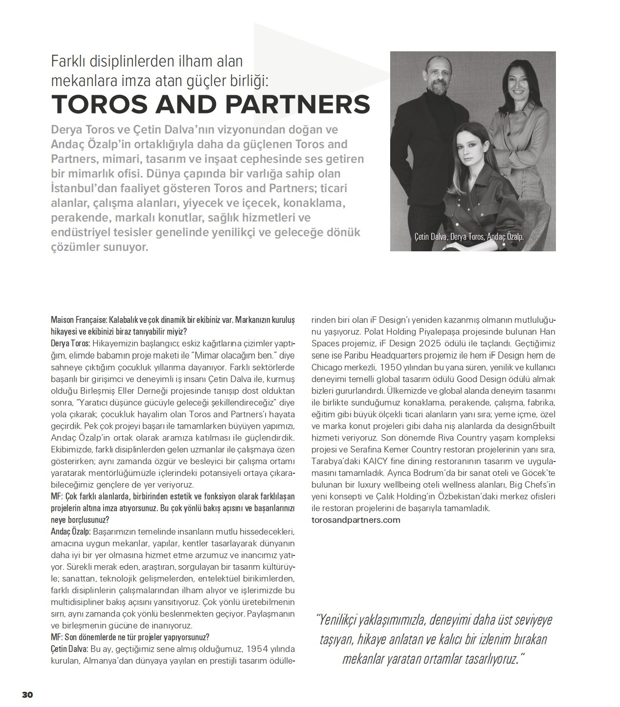 Toros and Partners, Maison Française tarafından hazırlanan seçkide Türkiye’nin yıldız mimarlık şirketleri arasında yer aldı. Ul
