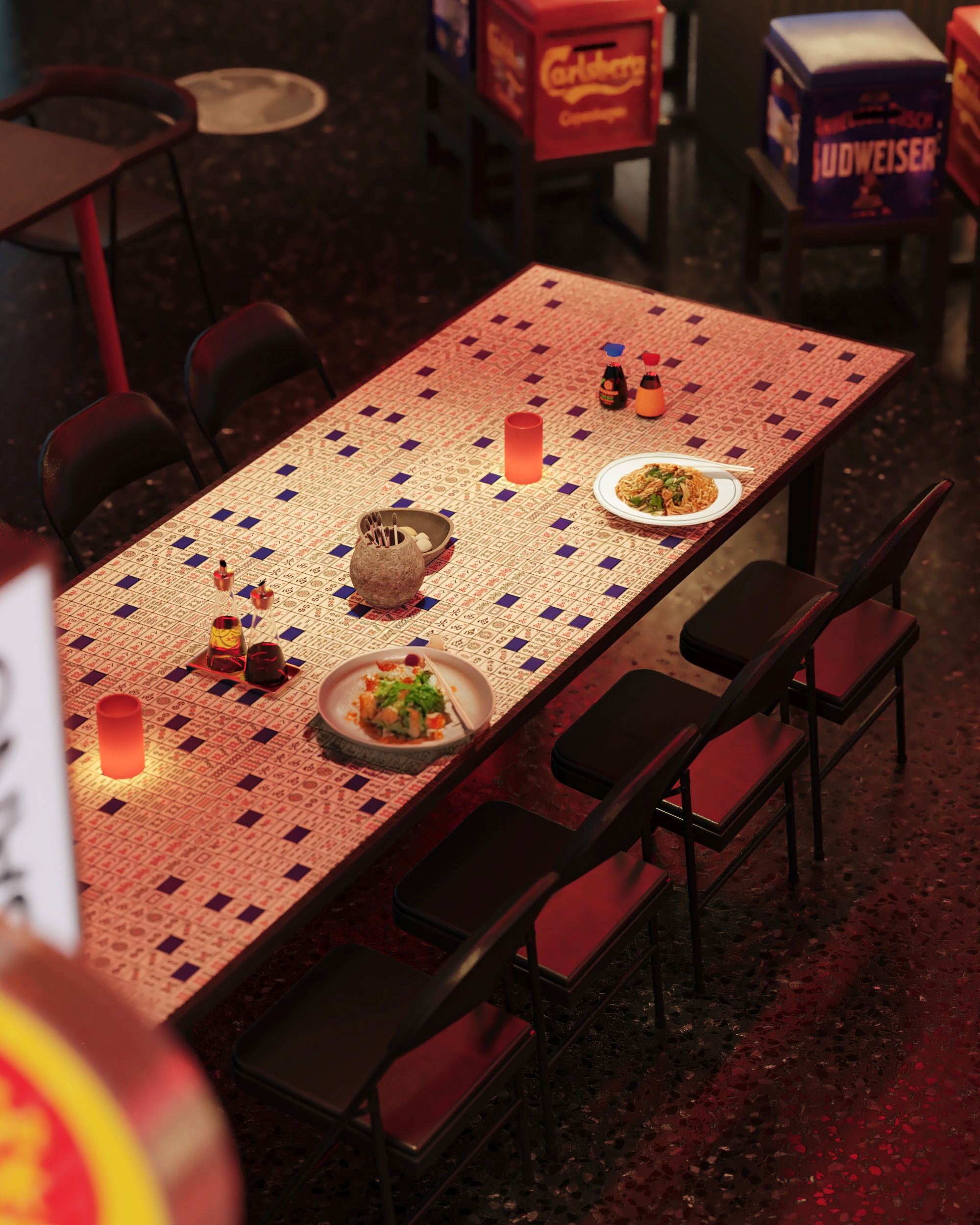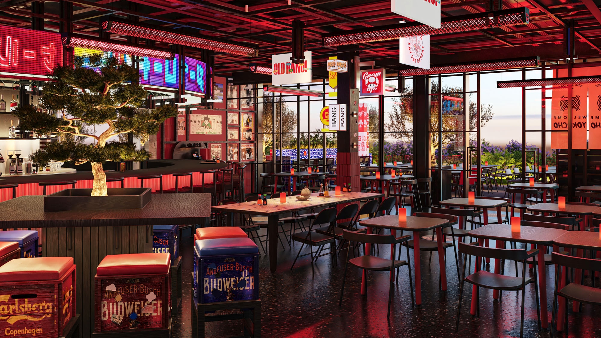 Inside, traditional Japanese references are reinterpreted through a contemporary design approach. Lighting inspired by Japanese tōrō lanterns and layered red illumination behind doorways introduce a cinematic warmth, reinforcing cultural references while enhancing spatial depth. Industrial elements, wooden textures, and Asian-inspired graphic posters contribute to a multi-layered environment that evokes the feeling of walking through a bustling Asian street.