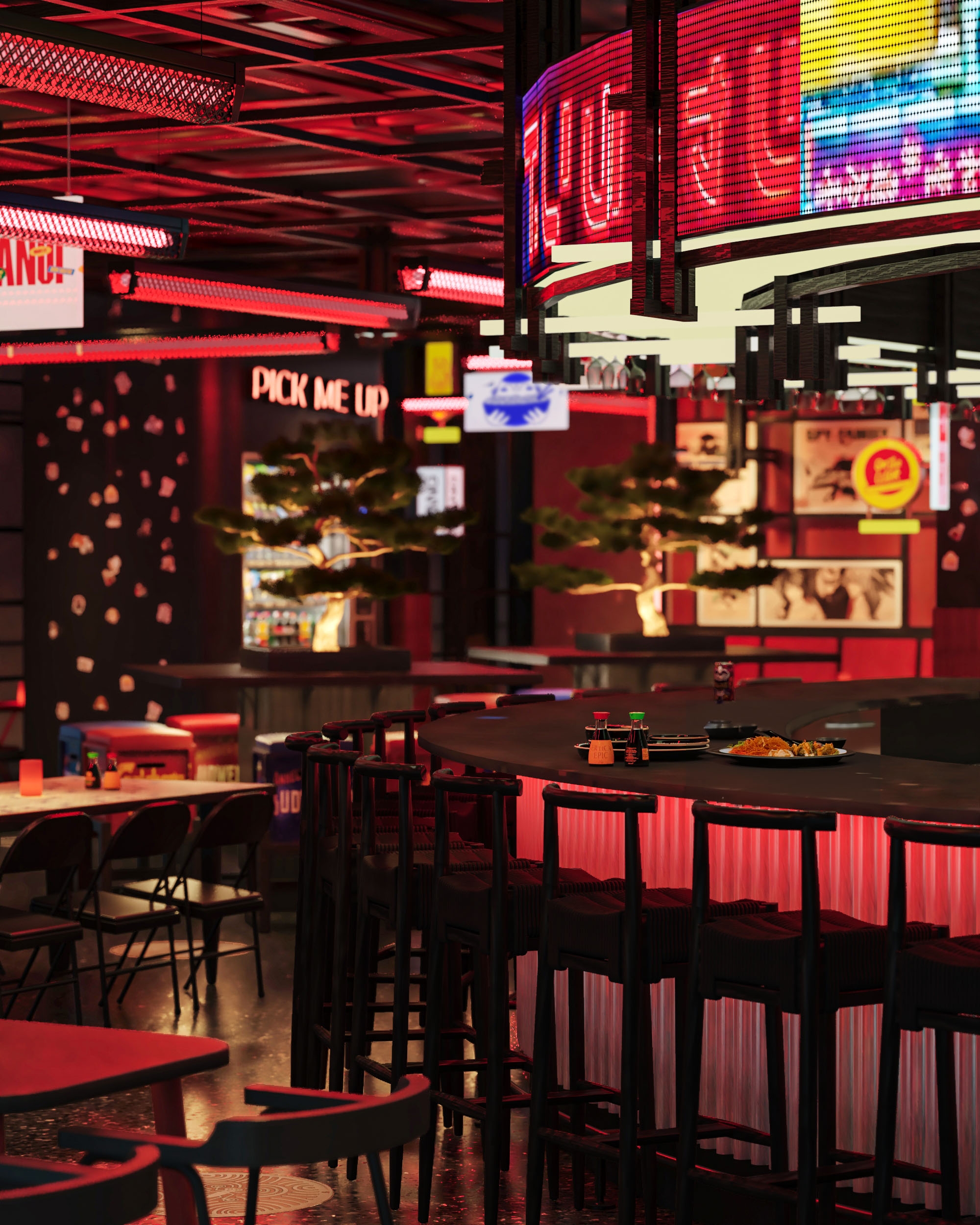 Seating arrangements are designed to encourage social interaction, while interactive elements such as a music selection box strengthen the street food concept. Digital screens integrated into the bar area introduce a technological layer that balances tradition with modernity. Bonsai trees and natural elements soften the industrial character, adding an organic contrast to the urban atmosphere.