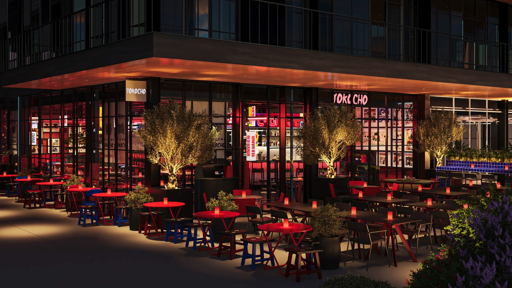 The interior architecture is shaped around a strong visual identity inspired by the lively atmosphere of Asian streets. Bold red and blue tones on the exterior, combined with black and red furniture, create an energetic and inviting presence, while ceramic surfaces reflect the dynamic rhythm of urban street culture. The Yokocho logo, composed of varied typographic expressions, brings the spontaneity of street aesthetics directly into the spatial language.